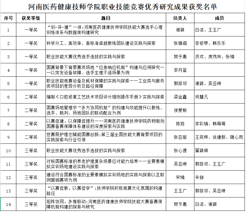 近日,河南省职业技术培训教研室发布《关于公布职业技能竞赛优秀研究成果评选活动获奖名单的通知》(豫职教〔2026〕5号),全省共评选出一等奖18项、二等奖26项、三等奖45项。河南医药健康技师学院在本次评选中表现突出,共斩获一等奖5项、二等奖4项、三等奖5项,彰显了