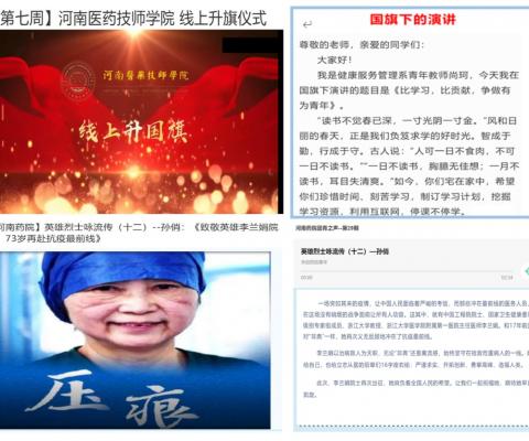 延迟开学期间,我院围绕立德树人根本任务,创新思政育人模式,拓宽思政育人载体,不断探索开展学生思政教育工作实践的多维度形式,采取线上升国旗、网络主题班会、学习防疫阻击战中涌现先进事迹等形式,开展爱国主义教育、生命教育和心理健康教育,推送钟南山、李兰娟等奋战在一线的科学家、医生、教师、军人等“战疫”先进事迹,弘扬社会美德,引导学生认真学习防疫阻击战中涌现的先进事迹,教育引导学生树立正确的世界观、人生观、价值观,增强学生爱党爱国爱人民爱社会主义的思想情感,激发学生将爱国情怀转化为防疫、抗疫的实际行动。通过各种丰富多彩的教学活动,同学们纷纷表示:开学延迟,我们对祖国的爱,不延迟!在今后学习和生活中,将以先进人物为榜样,争做中国特色社会主义合格建设者和可靠接班人。
