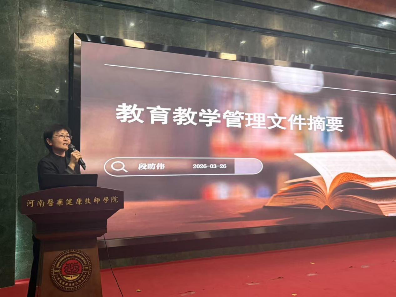 为全面总结2025年度教学工作成果,表彰先进、凝聚共识,部署2026年教育教学重点任务,推动 学校 教育教学高质量发展,3月26日下午,河南医药健康技师学院2025年度教学工作总结暨表彰大会在第一报告厅隆重举行。大会由教务处耿胜男同志主持, 学校 领导 、相关处室领导及全体任课教师参会。