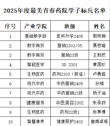 “时代的责任赋予青年,时代的光荣属于青年。”新时代的青年,承载着国家的未来与希望,是实现中华民族伟大复兴的先锋力量。为持续深入培育和践行社会主义核心价值观,充分发挥先进典型的示范引领作用,激励广大青年学子立大志、明大德、成大才、担大任,河南医药健康技师学院于2025年11月至12月组织开展了“最美青春药院学子”寻访评选活动。本次活动按照创新技能、志愿奉献、孝老爱亲、敬业自强标兵的寻访条件,在寻访的基础上,经各产业学院推荐、量化评比、现场宣讲、专家评审、大众评审、复审公示等程序,最终产生“最美青春药院学子标兵”10人和“最美青春药院学子”10人。