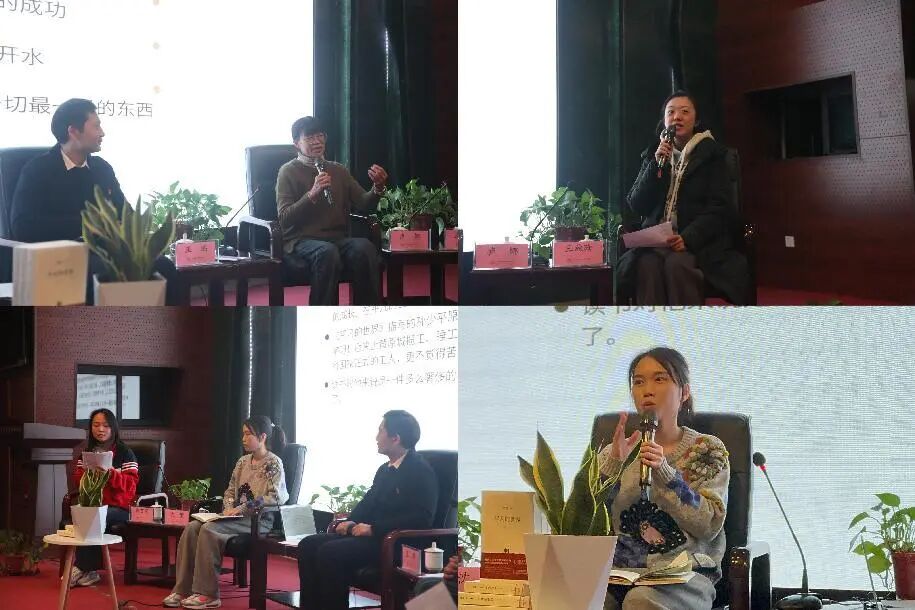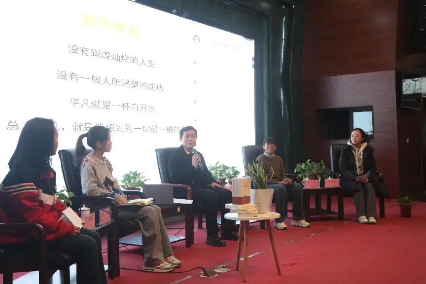 在随后的读书交流环节,邀请基础部教师卢娜、沈莹、党委办公室教师王秋晗、医药经贸系营销2406班学生郭艾荷进行深度分享。他们结合路遥《平凡的世界》相关情节和个人学习工作、生活经历,在王鹏的引导下参与平凡、责任、成长、奋斗、苦难五个话题的分享交流。大家各抒己见,思维的火花在交流中不断碰撞,现场气氛热烈而融洽,充分展现了师生们对这部经典作品的浓厚兴趣与深刻理解。