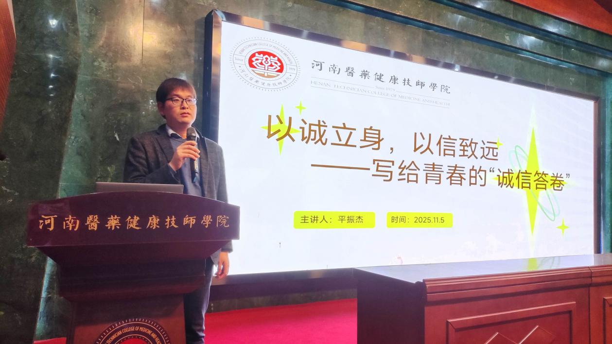 为引导药院学子树立诚信意识,筑牢道德根基,11月5日,以“以诚立身,以信致远——写给青春的‘诚信答卷’”为主题的专题讲座顺利开展。本次讲座由智慧康养产业学院副院长平振杰主讲,围绕诚信的重要意义、实践路径等核心内容,为在场学子上了一堂生动的诚信教育课。