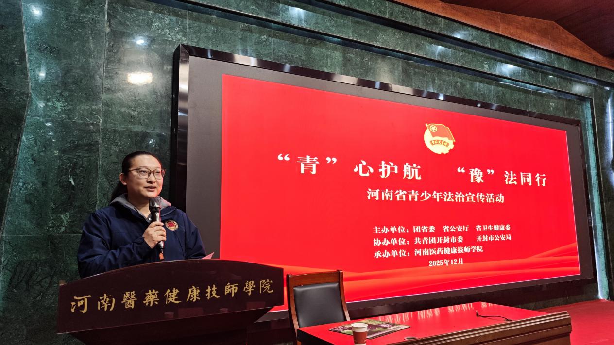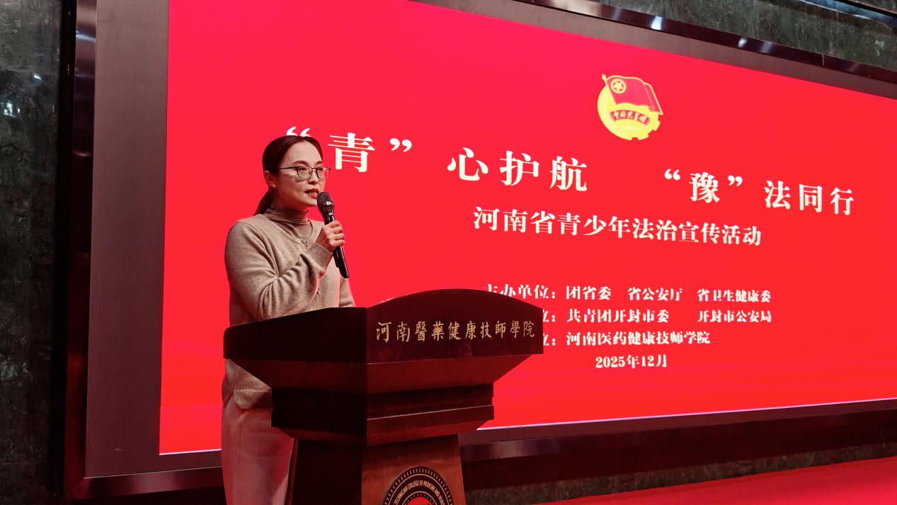 为增强青少年法治观念,提升自我保护能力,2025年12月11日下午,由团省委、省公安厅、省卫生健康委联合主办,共青团开封市委、开封市公安局协办,河南医药健康技师学院承办的“青心护航,豫法同行”主题活动在学校一号报告厅盛大举行。活动由郭晨老师主持。