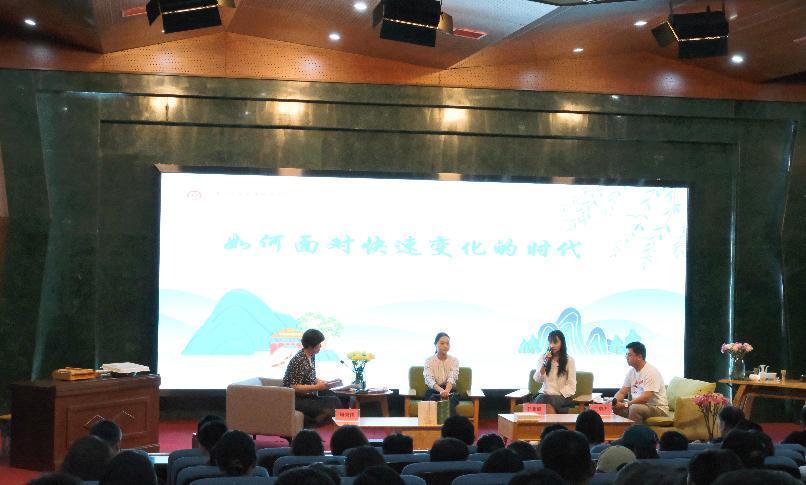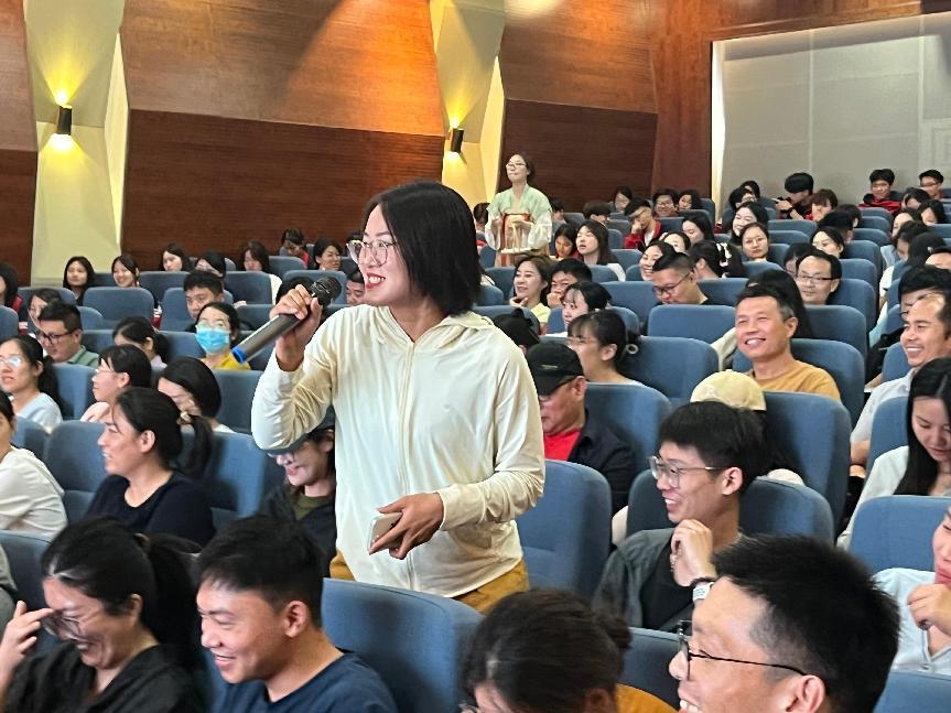当话题转向“如何面对快速变化的时代”,现场气氛渐入深境。周秉伟以东坡“一蓑烟雨任平生”的处世态度为引,与嘉宾们展开思辨:健康服务产业学院教师王瑞杰认为在AI技术浪潮席卷的当下,东坡的“定风波”精神依然具有现实意义;基础教学部教师韩亚男指出,东坡的通透在于“变”与“不变”的智慧——时代如风雨骤至,但内心的定力与对生命的热爱永恒;现代中药产业学院教师王冬艳则结合当下师生的焦虑现状,认为东坡精神的稳定内核,正是对抗信息过载的精神良药。在思维的共鸣中,东坡的千年智慧化作照进现实的光,为在场师生提供了应对时代挑战的精神良方。