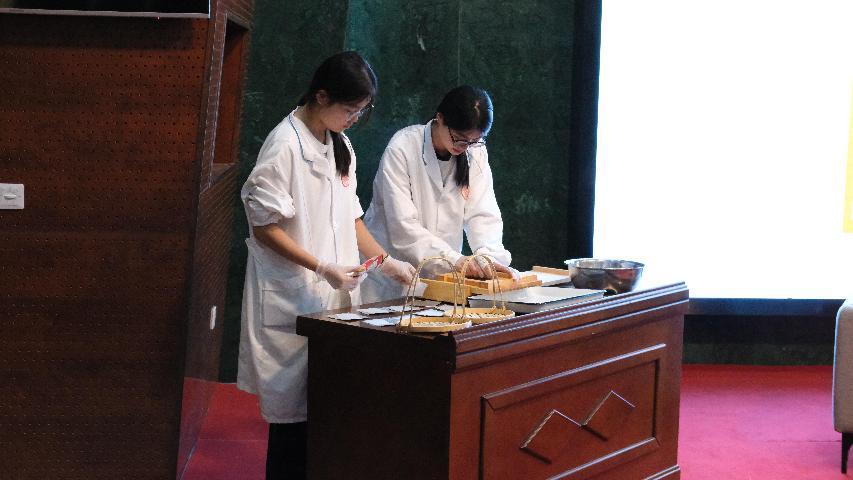 互动环节“诗词飞花令”将气氛推向高潮,以“书香药院开卷有益”八字为题,在场师生踊跃抢答,依次说出含每字的诗词。“腹有诗书气自华”等佳句频出,掌声此起彼伏。答对者获赠现代中药产业学院学生手工制作的山楂丸,既是对才思的褒奖,亦是学院特色的展示。与此同时,智慧康养产业学院学生带来精彩的点茶表演,书香药香茶香花香交融,尽显学院雅韵。
