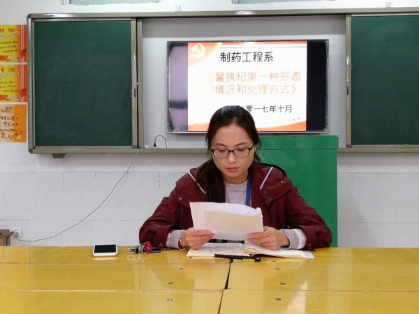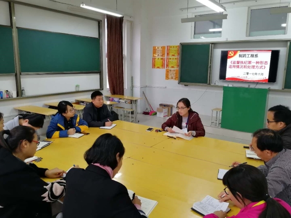 2017年10月,制药工程系党支部在教学楼A210开展了落实“四种形态”实施办法的动员大会,会议由制药系党支部书记李丽主持。