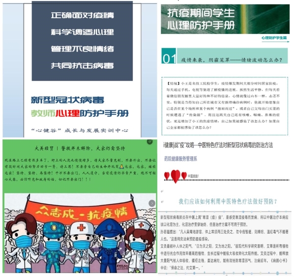 从学院整体的教学运行情况来看,全体同学以良好的精神面貌投入到网络课程学习中,全力支持疫情防控大局。全体授课教师也积极学习利用新技术手段,因地制宜、因时制宜,制定完善网络教学教案,在教学过程中关心关注每一名学生,以更大的耐心开展课程指导,提升了在线学习效果。同时,我院在开展线上教学的过程中非常重视师生的心理健康疏导和防疫知识的学习,为了在疫情期间能够有效的给师生心理咨询上的帮助,做好疫情防控的心理疏导,我院组织编写了《教师心理防护手册》及《学生心理防护手册》,帮助师生做好心理防护,消除疫情带来的负面心理影响;教师在进行专业课程授课的同时也对学生进行疫情防控知识的普及,加强生命教育、公共安全教育和心理健康教育,防止学生产生焦虑情绪,减少学生恐慌心理;及时向学生传达党和政府防控疫情的有力举措和周密方案,增强学生自我防病意识和疫情防控信心,做到科学防控疫情。
