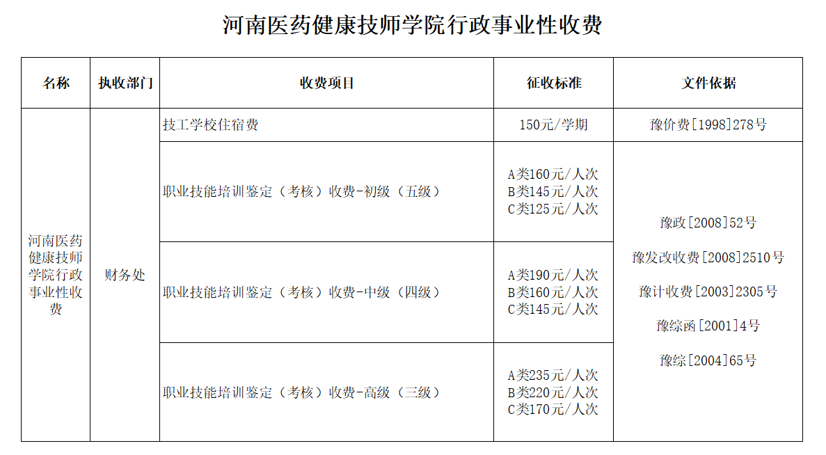 2021年河南医药健康技师学院行政事业性收费标准公示