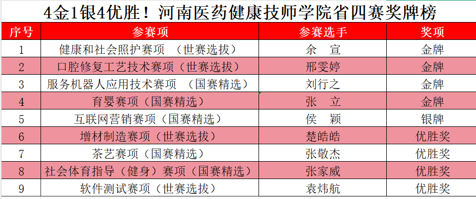 4月24日, 河南省第四届职业技能大赛 在河南新乡 圆满落幕,河南医药健康技师学院参赛学子奋勇拼搏、不负众望,在众多参赛队伍中脱颖而出,斩获4金1银4优胜 , ,成绩亮眼,答卷出色。