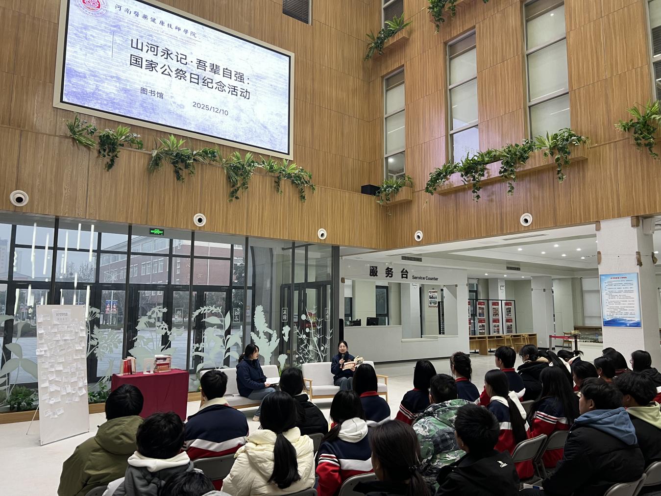 “昭昭前事,惕惕后人。”在国家公祭日来临之际,为引导广大师生深植历史记忆、传承爱国精神, 2025年12 月 10 日16时,河南药院图书馆举行 “ 山河永记,吾辈自强 ” 国家公祭日主题读书活动 ,全体读书委员和品唯书友社学生参与活动。