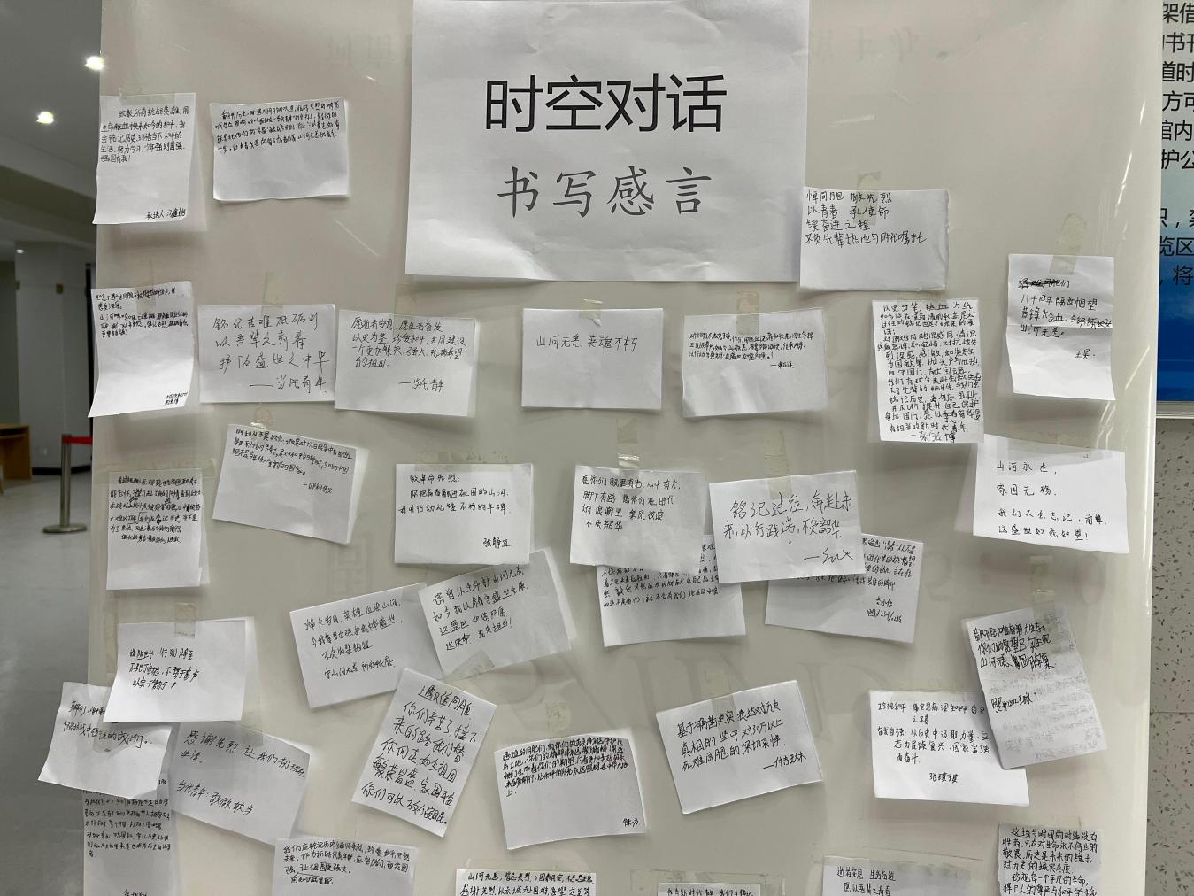 在互动环节,每位同学都领到一张印有历史印记的卡片。同学们俯身执笔,将心中的哀思与决心化为文字:“以青春护家国,以热血继荣光”“盛世来之不易,吾辈应当自强”……一笔一画间,是对先烈的告慰,更是对未来的承诺。同学们依次上前,将签名感言卡郑重张贴在“时空对话”墙上,很快便汇成一片承载初心与使命的精神阵地。