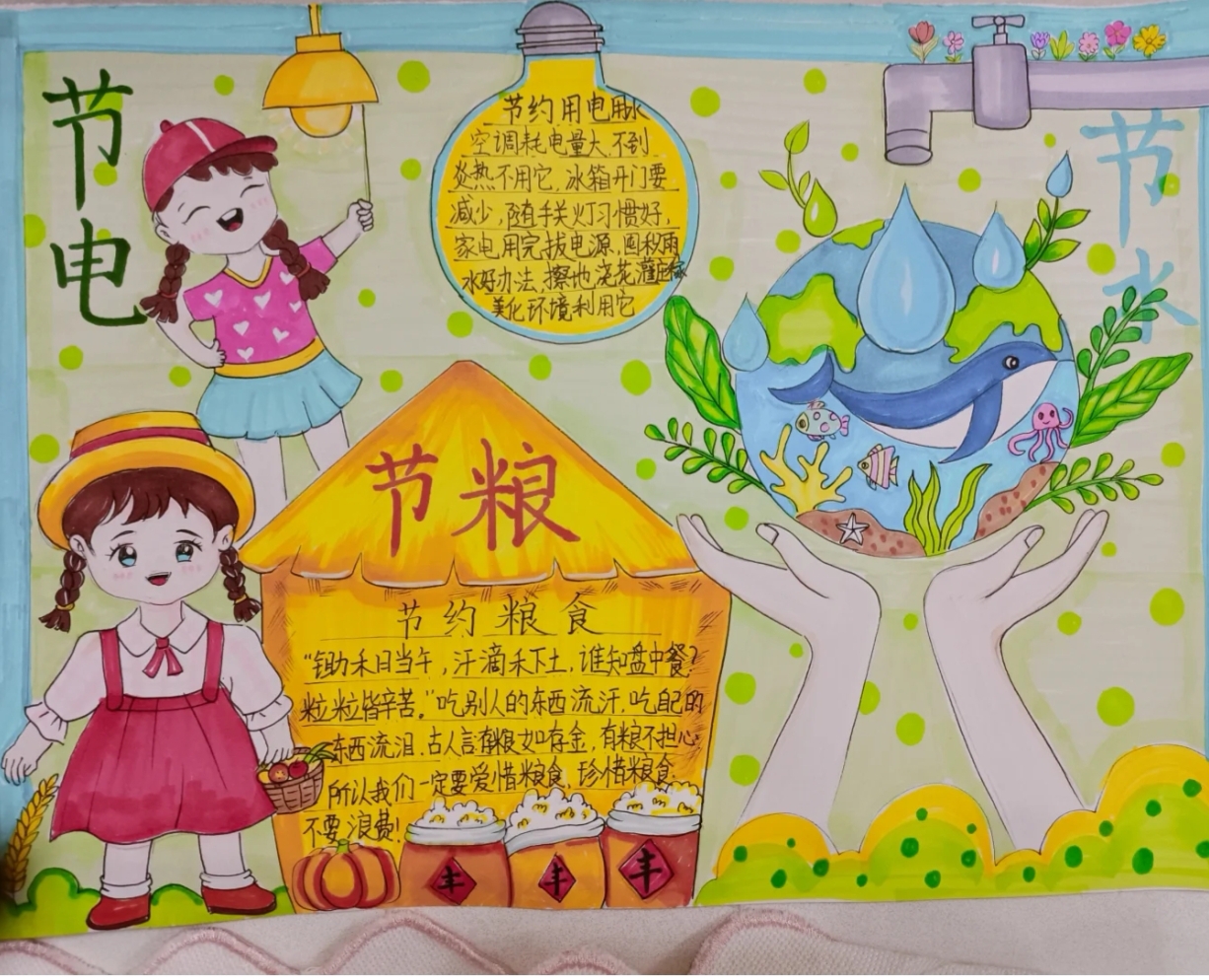 各班级纷纷开展了以“节能节电节粮,从我做起”为主题的班会。班会上, 同学们还精心绘画了手抄报 ,向大家展示了全球资源的现状、我国面临的资源挑战以及校园中存在的浪费现象,如教室人走灯未关、水龙头长流水、食堂大量剩饭剩菜等,让同学们深刻认识到节约的紧迫性和必要性。同学们积极参与讨论,分享自己在生活中的节约经验,提出了许多实用的建议,如用洗菜水浇花、及时关闭电器电源、根据食量打饭等。