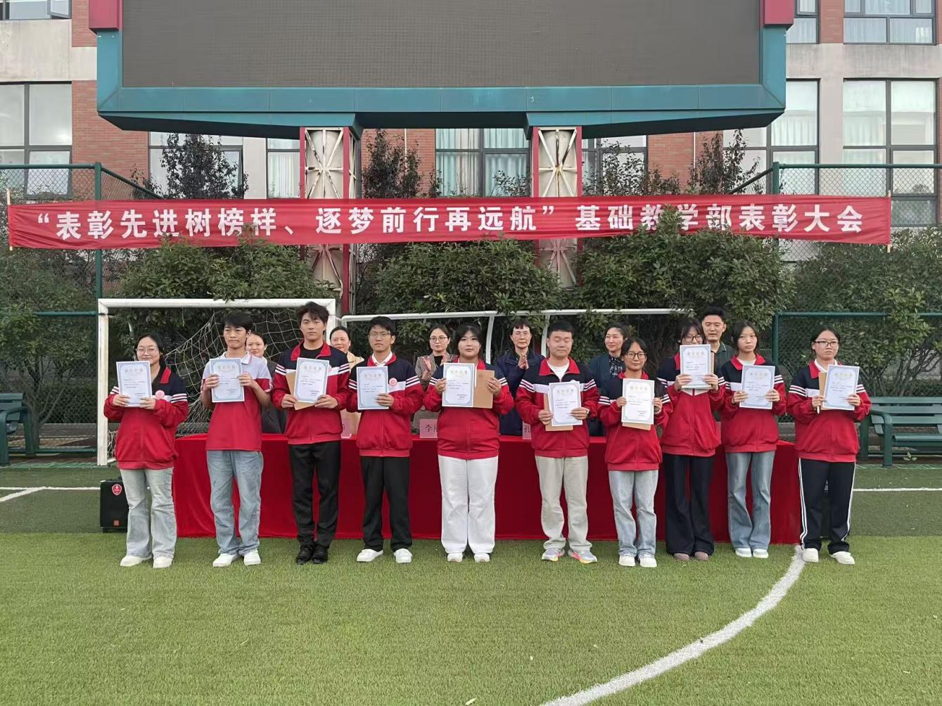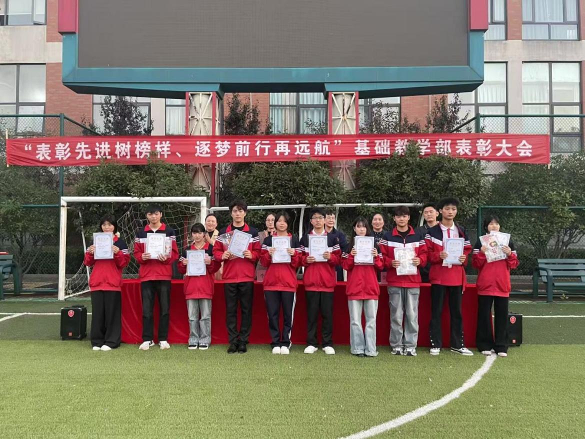 金风送爽,捷报频传。为树立青春榜样,激发全体学子升学斗志, 基础教学部于2025年9月24日 在学校足球场举行 “ 表彰先进树榜样逐梦前行再远航 ”基础教学部表彰大会 。学校党委委员、副校长李丽 、 学生工作处处长孔玲玲、 升学班教师及全体学生齐聚一堂,共同打造了一场集荣誉表彰、经验分享、未来展望于一体的成长盛宴。