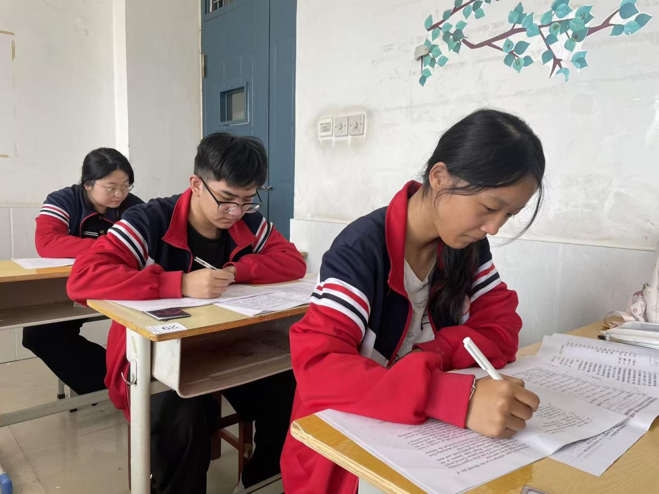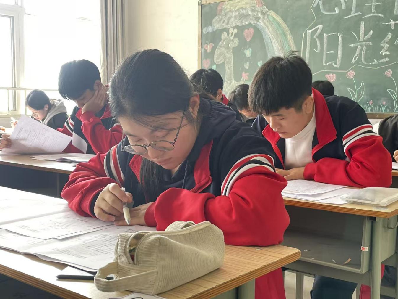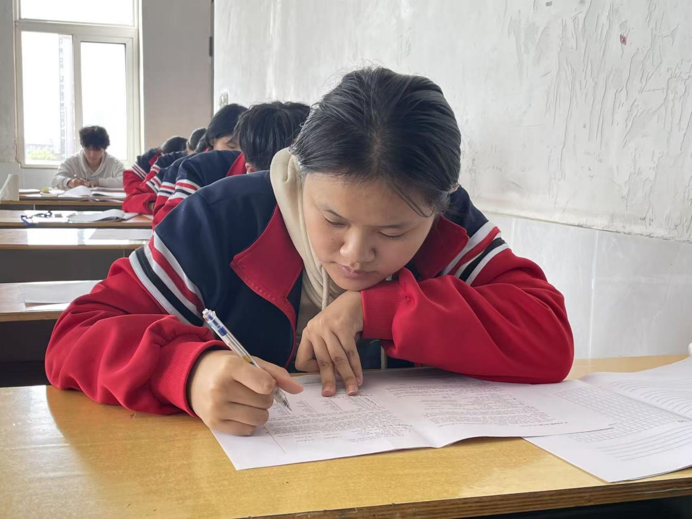 考试当日,监考教师提前抵达考场,仔细核对密封试卷袋完整性,逐一检查考生信息。开考铃声响起后,升学班学子们凝神蹙眉、认真审题、提笔疾书,在试卷上细致书写每一个答案。巡考教师轻步穿梭于考场之间,既维护着考场纪律,也默默为学子们注入安心力量。