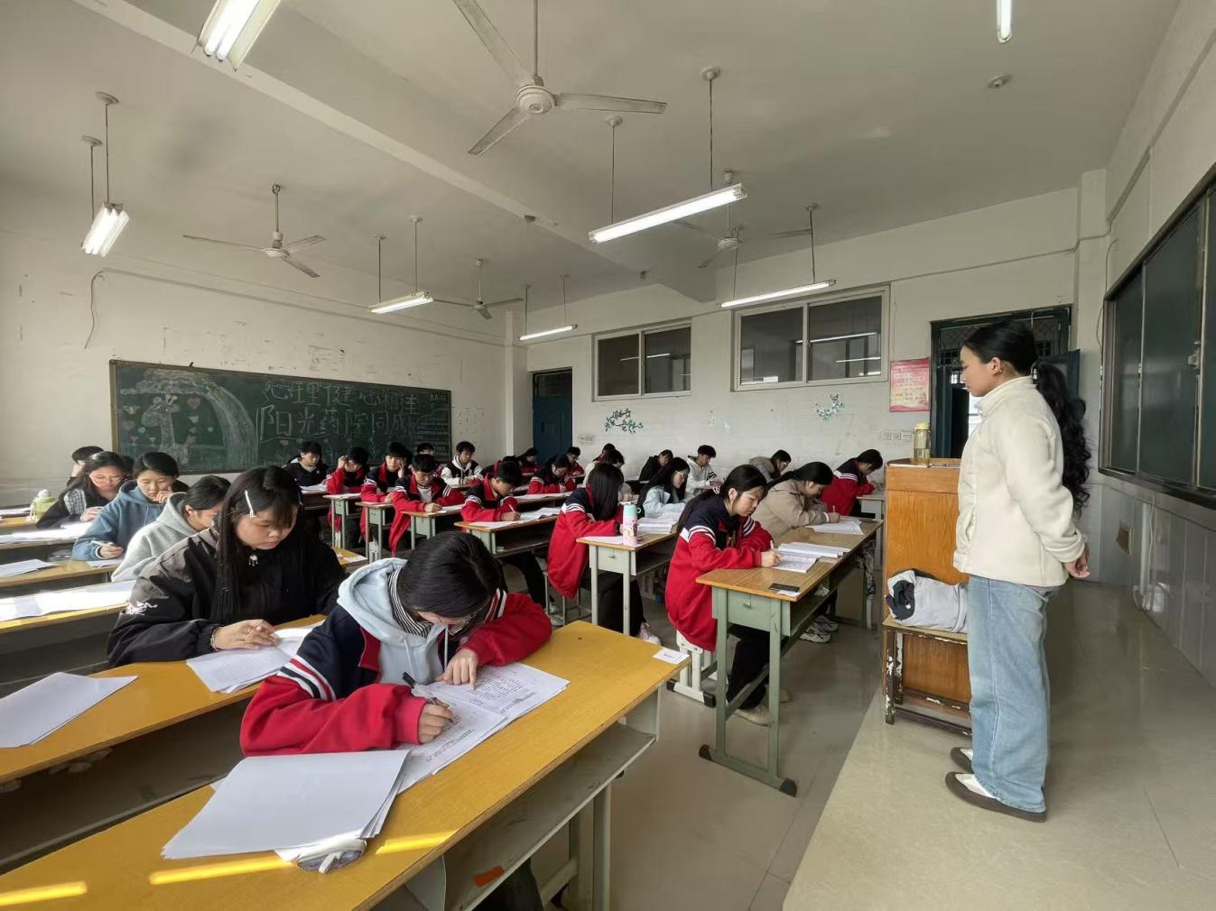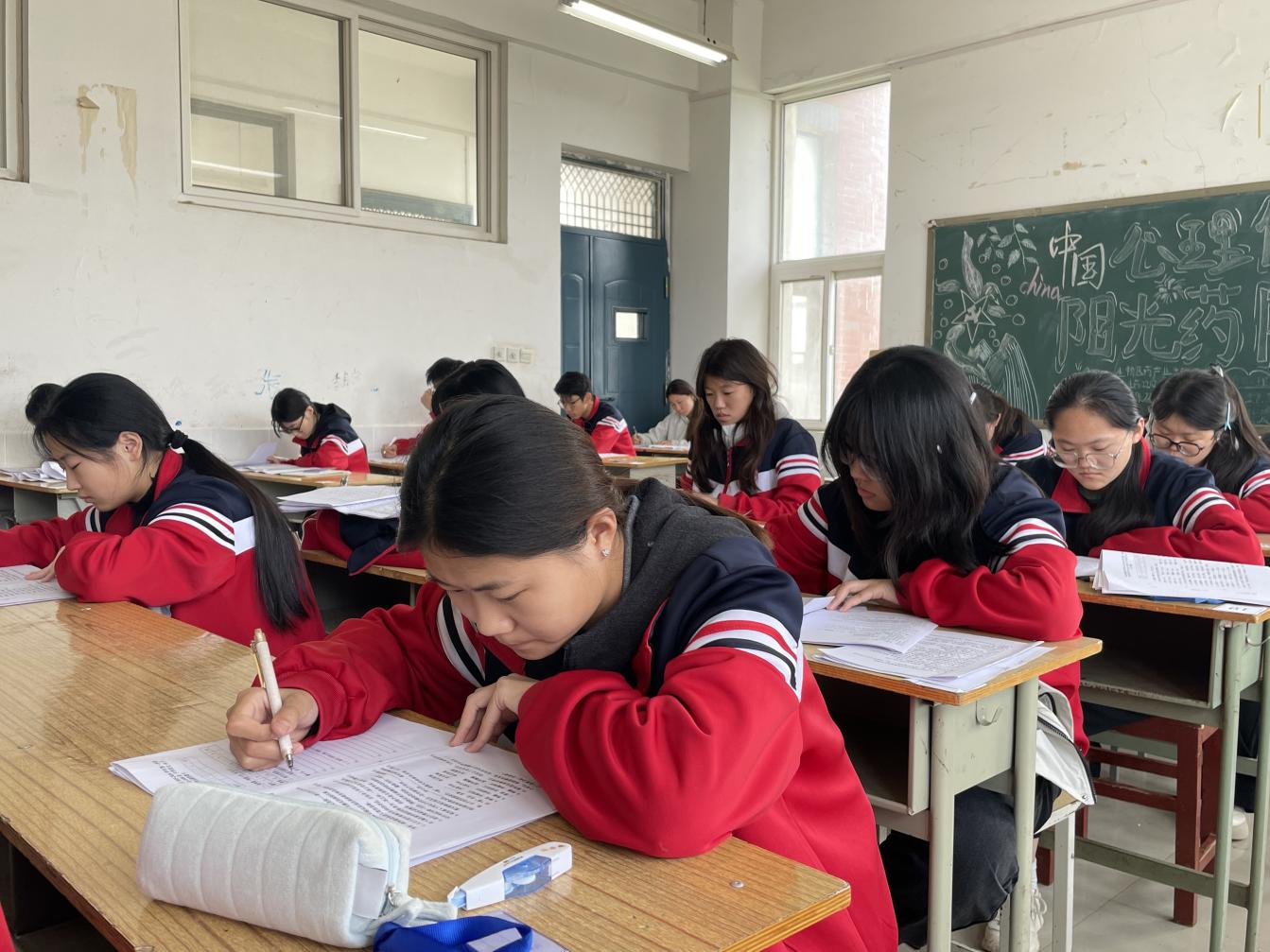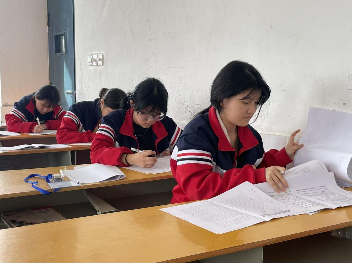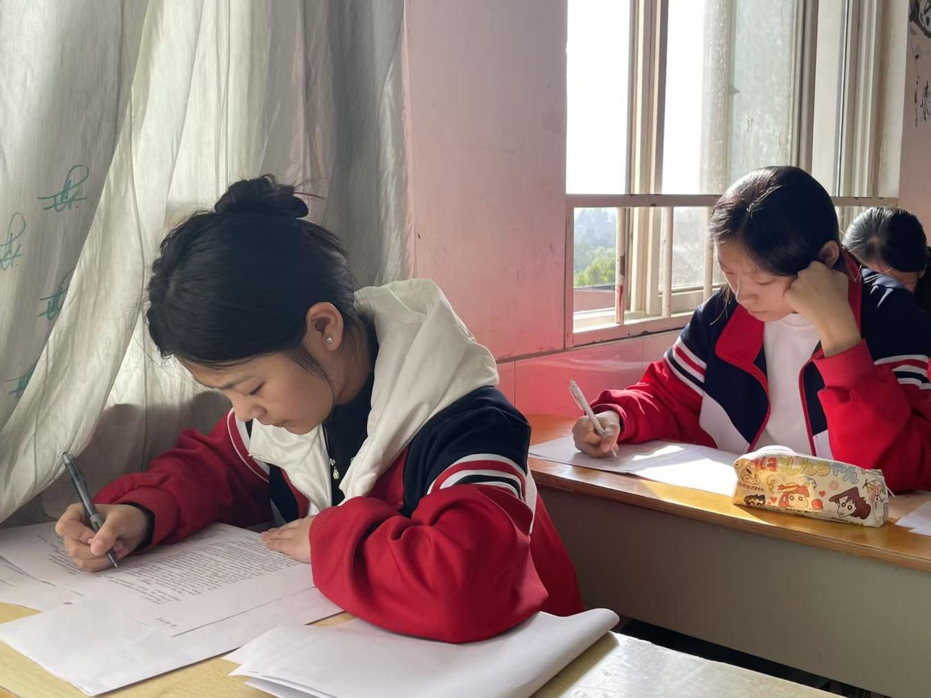 考试当日,监考教师提前抵达考场,仔细核对密封试卷袋完整性,逐一检查考生信息。开考铃声响起后,升学班学子们凝神蹙眉、认真审题、提笔疾书,在试卷上细致书写每一个答案。巡考教师轻步穿梭于考场之间,既维护着考场纪律,也默默为学子们注入安心力量。