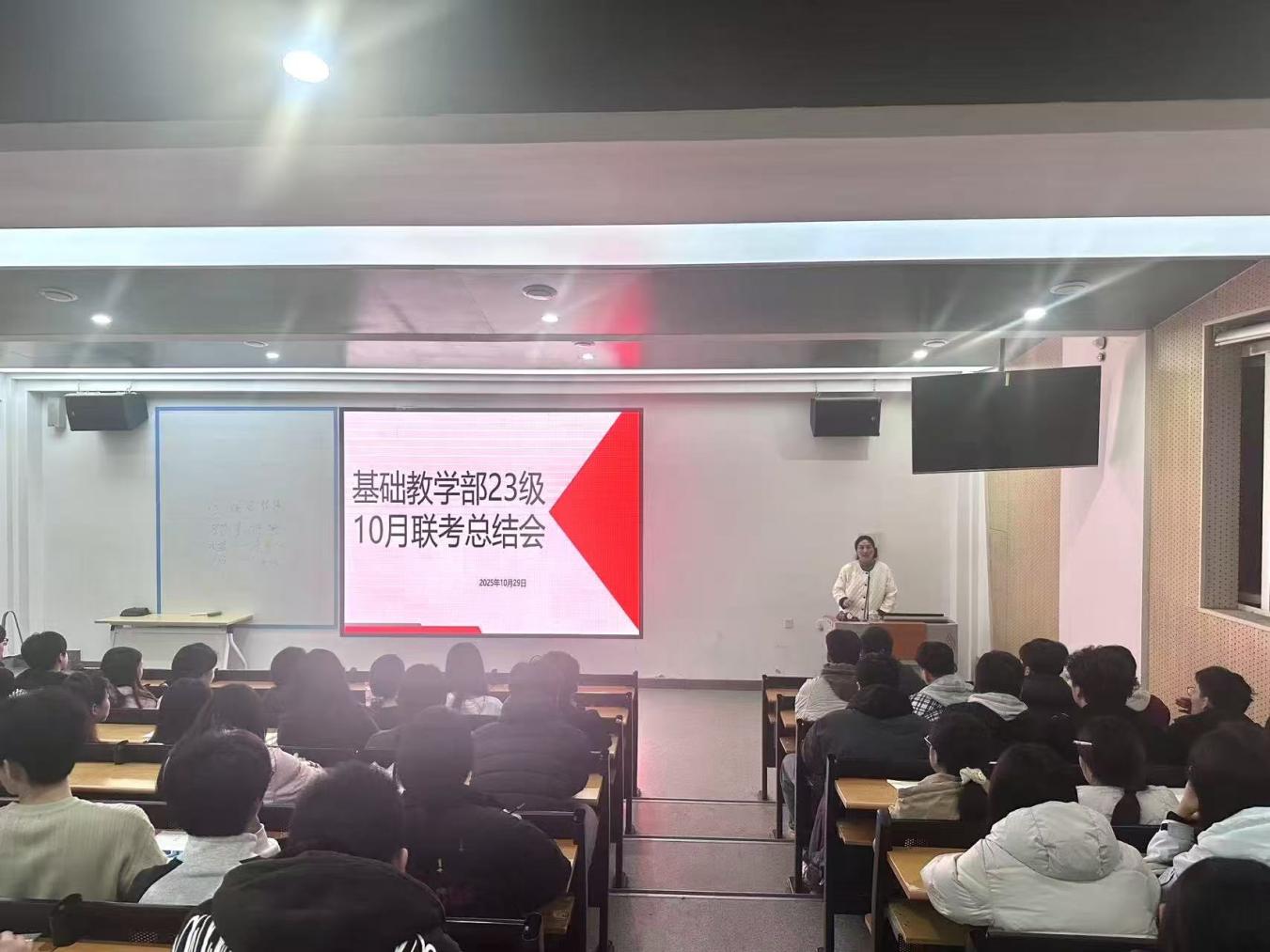 为进一步总结经验、明确后续备考方向与升学路径,基础教学部于2025年10月29日晚在智慧教室 103 组织召开2023级学生月考联考总结会及对口升学动员会议。会议由基础教学部副主任李瑞杰主持。